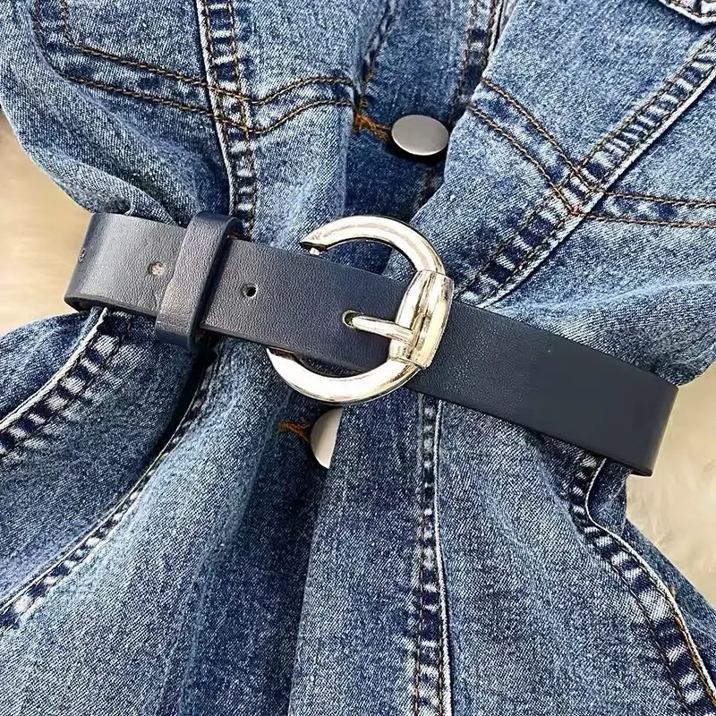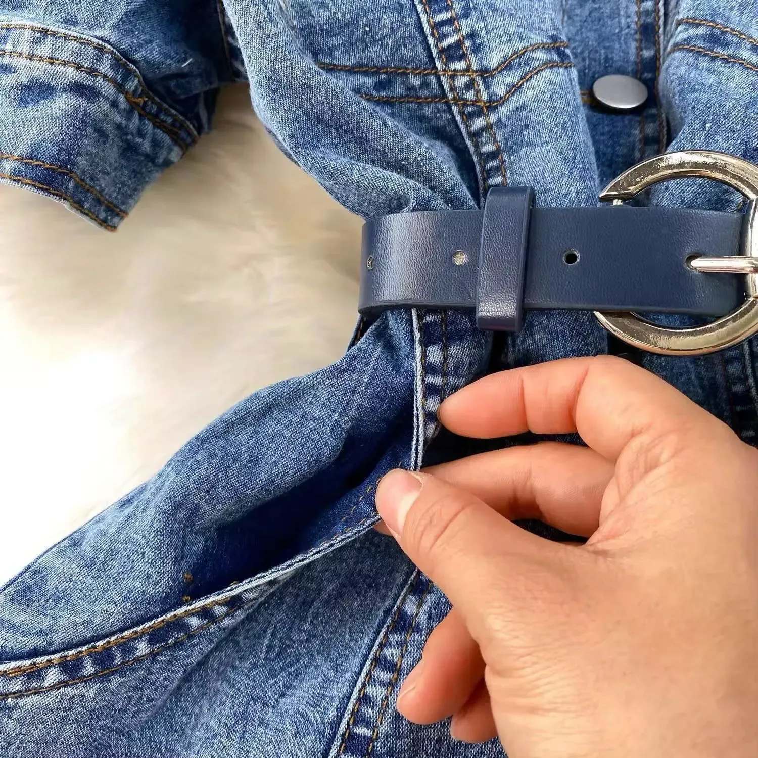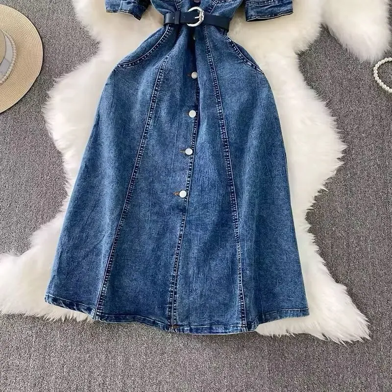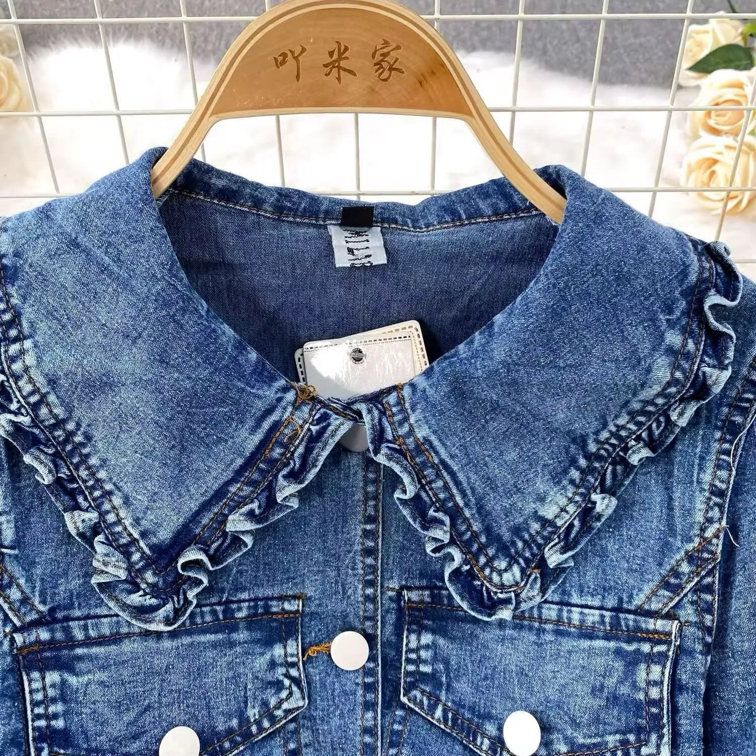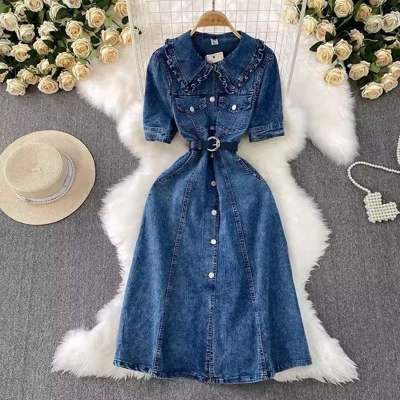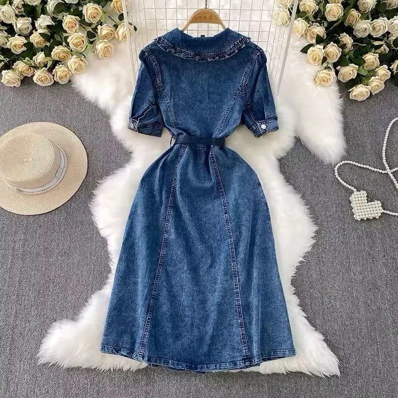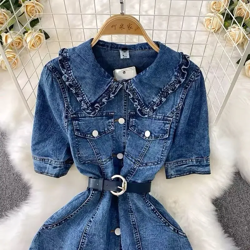 Vestido de Mezclilla Azul con Cuello de Volantes y Botones