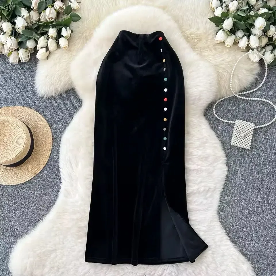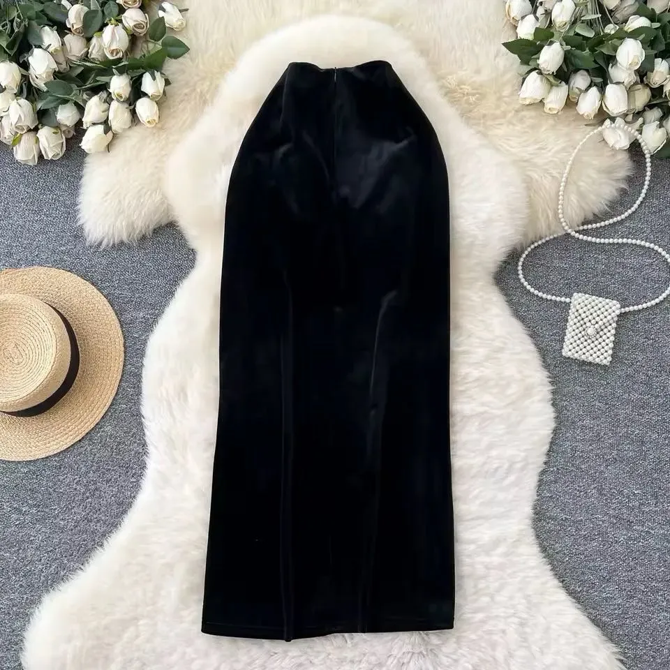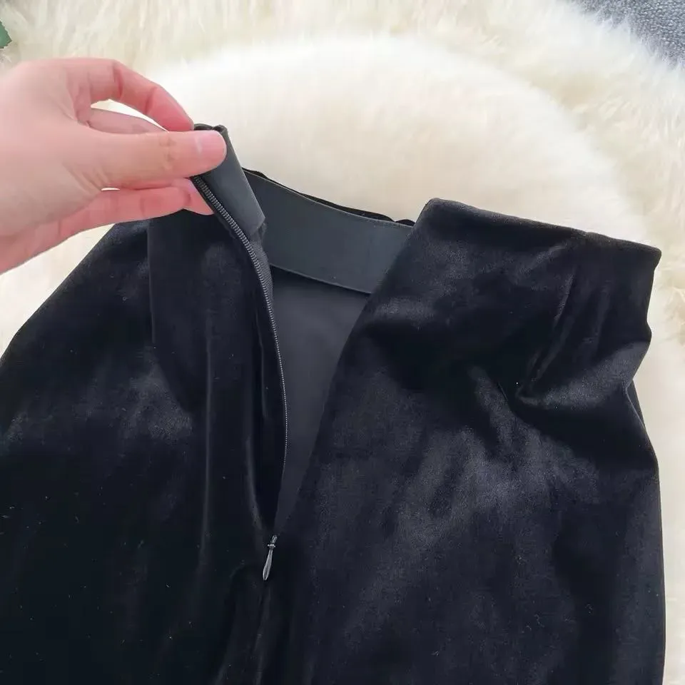 Falda de Terciopelo Negro con Detalles de Perlas y Sombrero